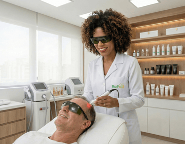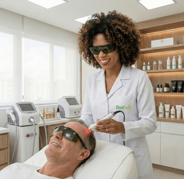 Se o seu problema é localizado — aquela falha na testa ou no topo da cabeça que não fecha nunca — suplementos sozinhos podem não dar conta. Você precisa de algo que "acorde" o folículo capilar naquela área específica.