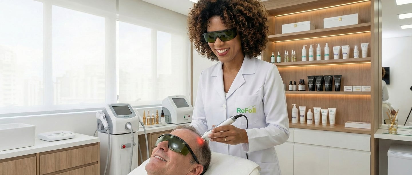 Tecnologia em Casa: O uso de LEDterapia e fotobioestimulação (como os capacetes de LED) é o que há de mais moderno para "acordar" a raiz sem precisar de cirurgia.